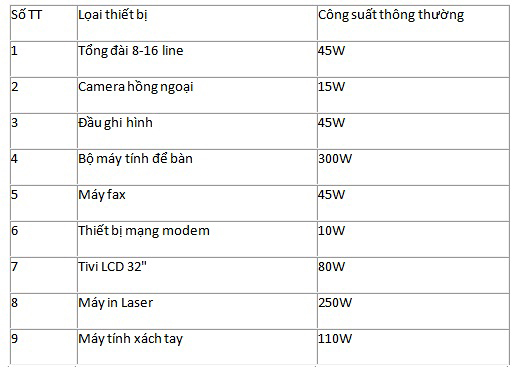 Bước một: Tính tổng gộp công suất thực tế của tất cả thiết bị trong văn phòng (có thể tham khảo bảng dưới đây).